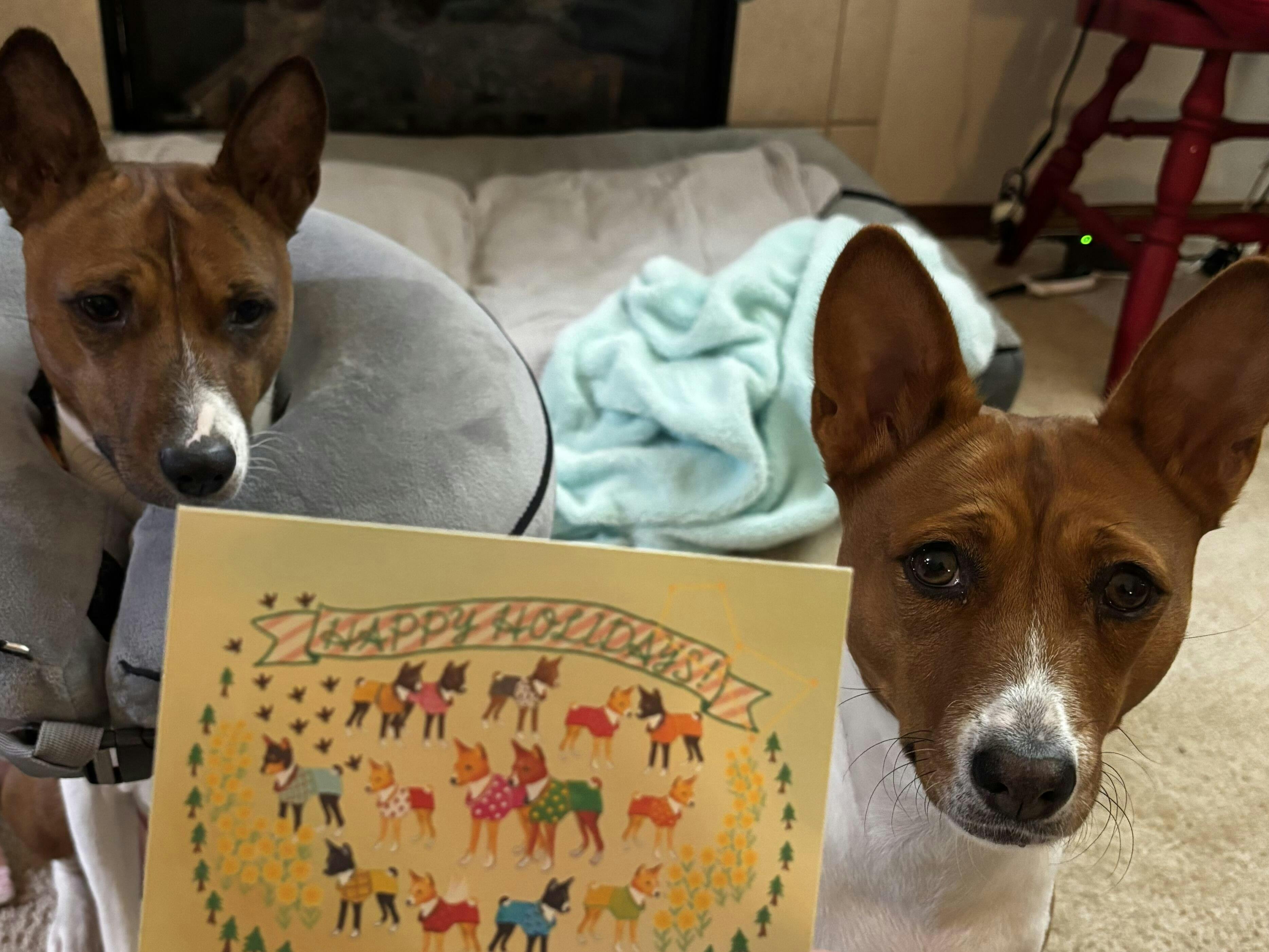 ・You may submit your basenji's photo (upload on the right side of this page) for a modification to one of the basenjis on the card. Customizations are limited to the muzzle area, overall color of your basenji(s) - Necks, legs, and tail, etc. remain unchanged (They all have the same pattern)