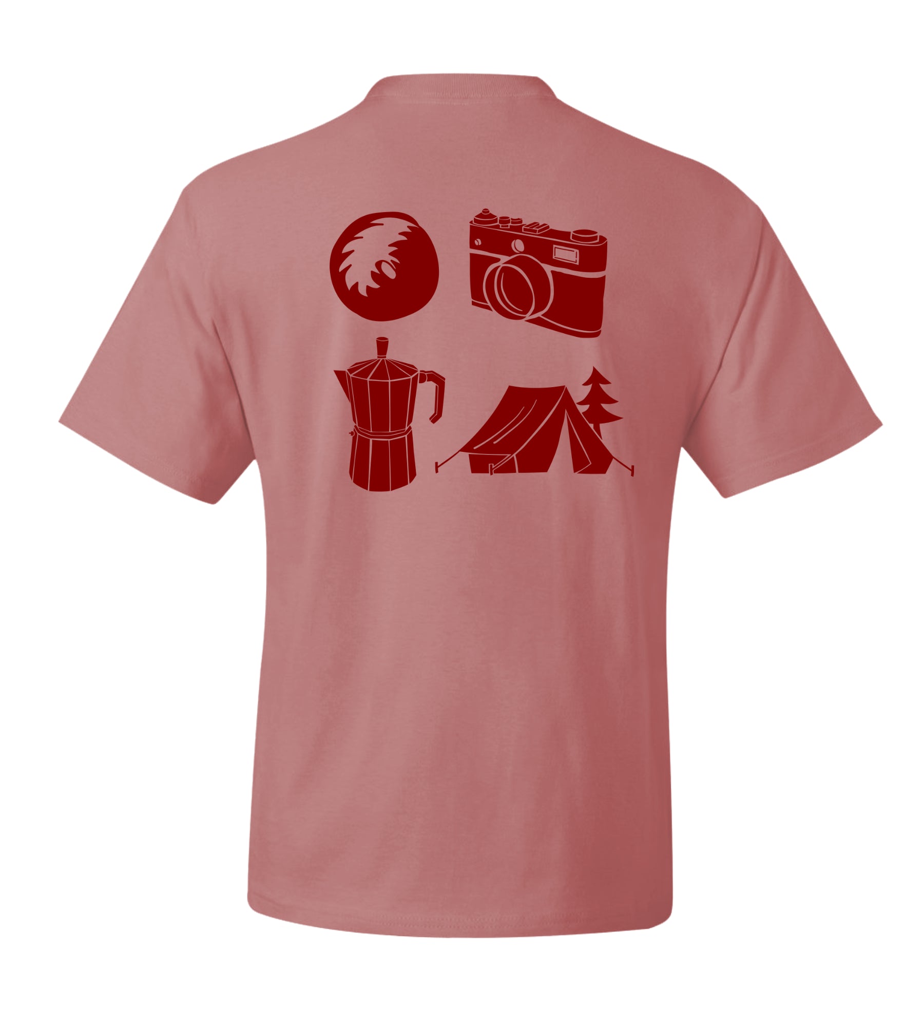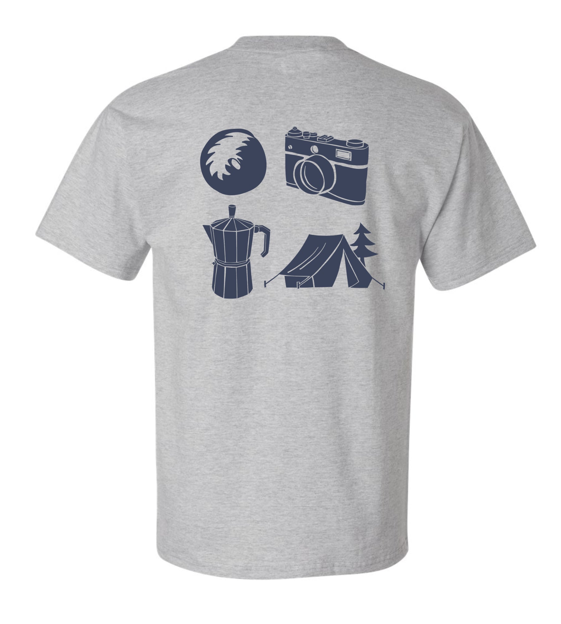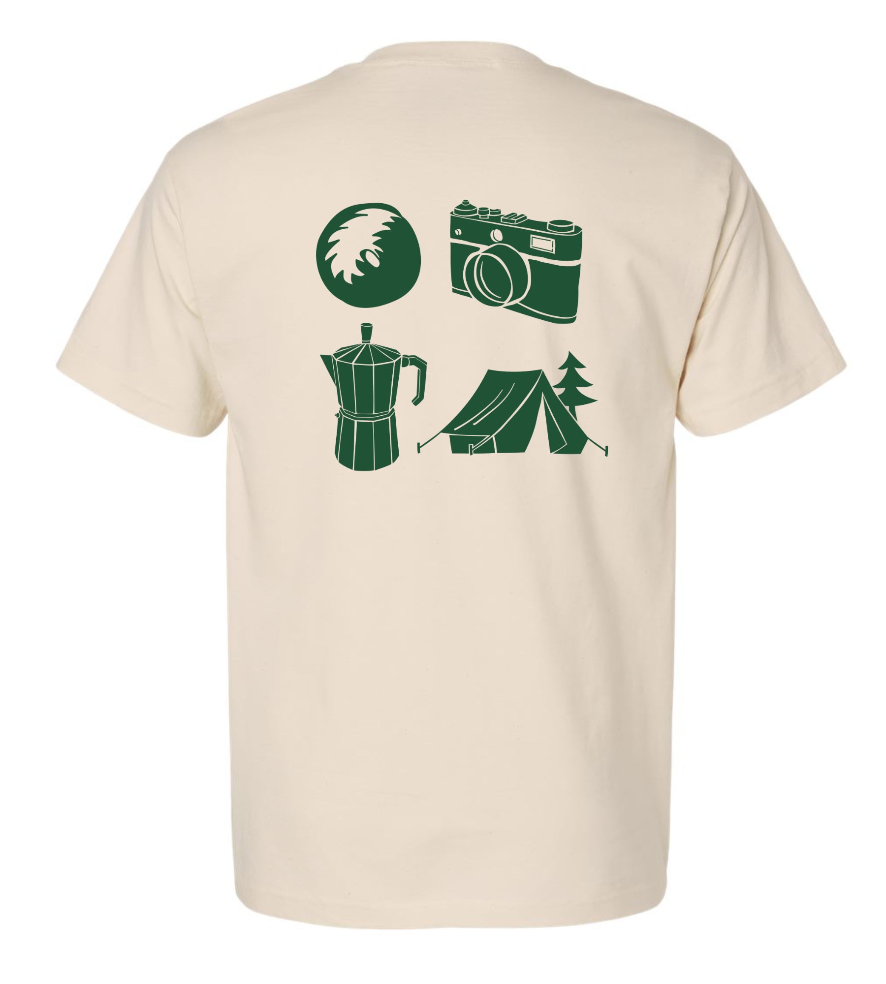 ・Back: Four elements representing one of the “Fantastic Times” — a donut-shaped Basenji tail, a camera, an espresso maker, and a tent